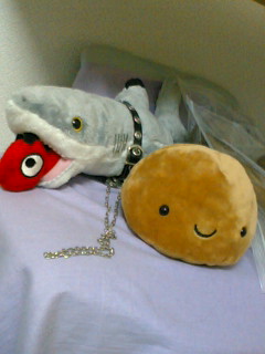 鮫子+食われてるあかべえ、温泉まんじゅうくんINプリンターの上。
